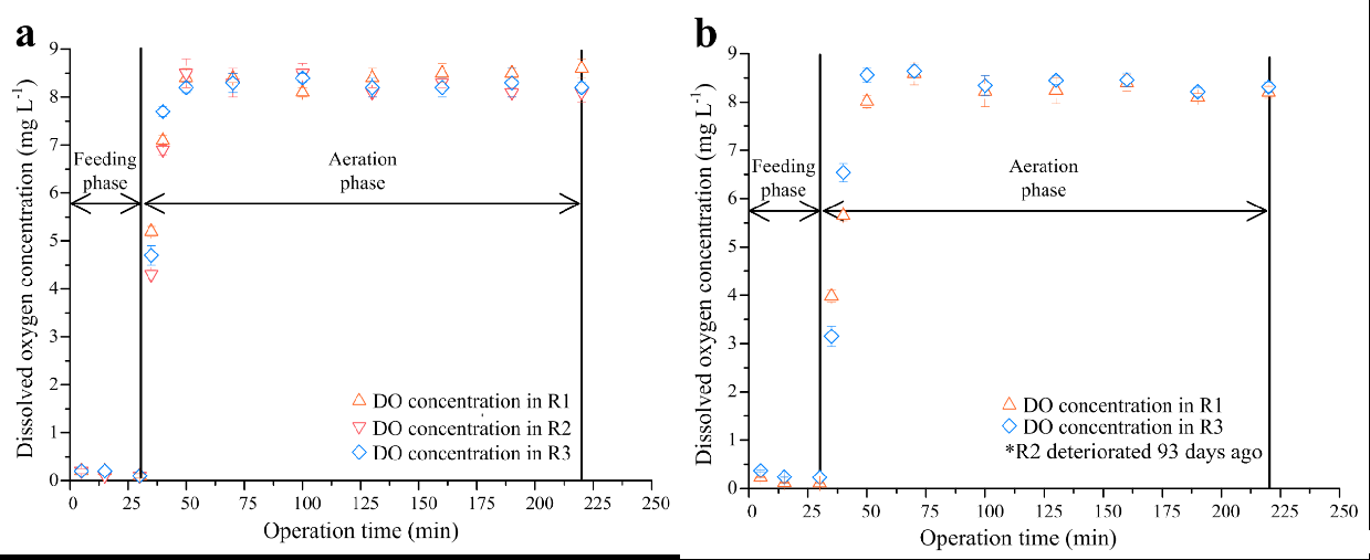 圖3、三個污水處理反應(yīng)器反應(yīng)器運行53天(a)和166天(b)后運行周期的溶氧剖面圖。