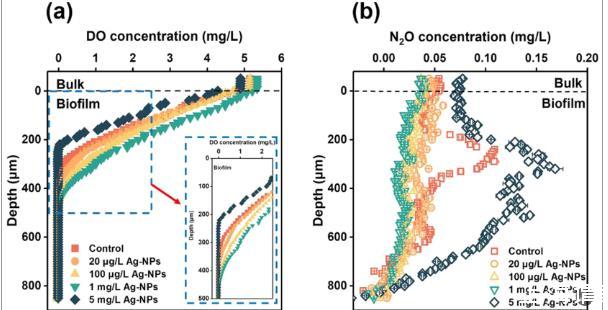 圖4、(a)DO濃度和(b)長期暴露后生物膜中N2O排放的深度分布曲線。從圖a中可以看出發現隨著生物膜深度的增加,DO含量逐漸下降,當生物膜暴露于5 mg/L Ag-NPs時,DO水平的快速降低形成較大厭氧區。從圖b可以看出,當在用5 mg/L Ag-NPs處理后,N2O主要在生物膜的低DO區域(即<160μm)中產生。表明暴露于5 mg/L Ag-NPs的生物膜形成了低DO條件以成功促進反硝化。
