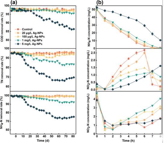 圖1、(a)COD、TN和NH4-N在長期暴露過程中的平均去除率,(b)NH4-N、NO2-N和NO3-N在典型循環中的變化。