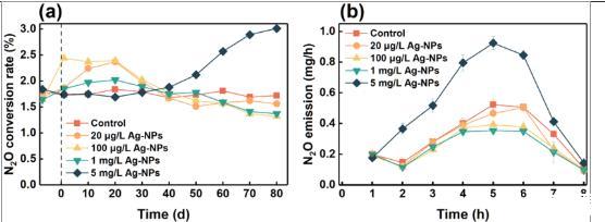 圖2、0μg/L、20μg/L、100μg/L、1 mg/L和5 mg/L Ag-NPs對(a)長期暴露和(b)典型暴露期間N 2 O排放的影響循環。從圖中分析可以看出第30天是長時間暴露于不同濃度的Ag-NP后N2O轉化率變化的轉折點。在長期暴露期間,高濃度的Ag-NPs(即5 mg/L)會刺激N2O轉化。相比之下,在前30天,R2、R3和R4的最大N2O轉化率(分別在第20天、第1天和第20天)與對照相比分別增加了37.79±0.2%、41.04±1.4%和17.44±0.4%。