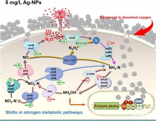 研究的結果表明,低劑量的Ag-NPs(<1 mg/L)可以輕微抑制N2O的產生,而高劑量(5 mg/L)的Ag-NPs會刺激N2O的排放。這種對高劑量Ag-NPs的刺激是由于以下原因:(i)長期暴露后,高含量的Ag-NPs會在生物膜表面積累,然后在生物膜表面構建厭氧區。(ii)厭氧區提醒微生物群落,觸發nar B和nir K基因的相對豐度。(iii)相關基因豐度的上調可能是刺激亞硝酸鹽還原途徑釋放N2O的原因.這些發現共同表明長期暴露于高劑量的Ag-NPs可以通過在生物膜中形成厭氧微環境來增加N2O排放。因此在大型污水處理廠長期運行過程中,需要精確和充分的曝氣或低SRT,以避免形成厭氧微環境,從而減少N2O的產生。