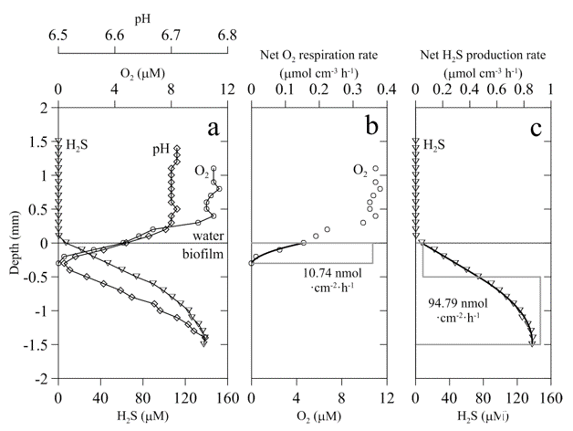 圖1、廢水生物膜中的垂直H2S、O2和pH曲線和模擬的反應速率。(a)1.5 mM硫酸鹽和無硝酸鹽的生物膜中的代表性H2S(三角形)、O2(圓形)和pH(菱形)分布;(b)和(c)分別模擬了O 2和H2S的濃度分布(粗黑線)和體積反應速率(灰色直線)。具有相同速率的深度決定了生物膜微分區。還指出了O 2消耗的面積率和硫化物凈產量(nmol cm-2 h-1)。