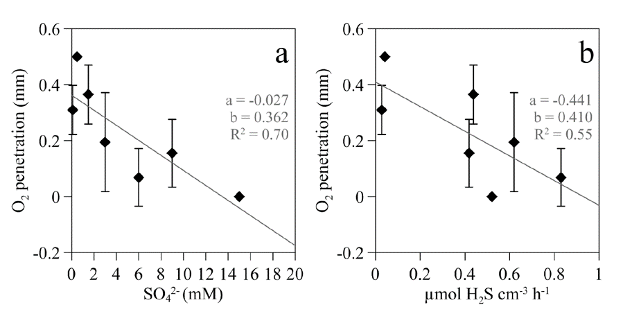 圖3、廢水生物膜中的最大氧氣滲透深度。(a)在本體水相中不同硫酸鹽濃度下生物膜中的最大氧氣穿透深度(Zox)和(b)生物膜中的最大氧氣穿透深度(Zox)作為上部生產層中硫化物產率的函數。條形代表平均值的標準偏差(從n=2(0.5和20 mM的滲透值)、8(6和15 mM的值)或10(其余)剖面的O2滲透深度。)。在每個圖中插入的是回歸線的斜率(a)、截距(b)和決定系數(R2)。從圖中可以看出,硫酸鹽的有效性極大地影響了氧氣向生物膜的滲透。盡管生物膜之間存在很大差異,但隨著硫酸鹽濃度和凈硫化物產率的增加,進入生物膜的最大氧氣深度(z O)線性下降。