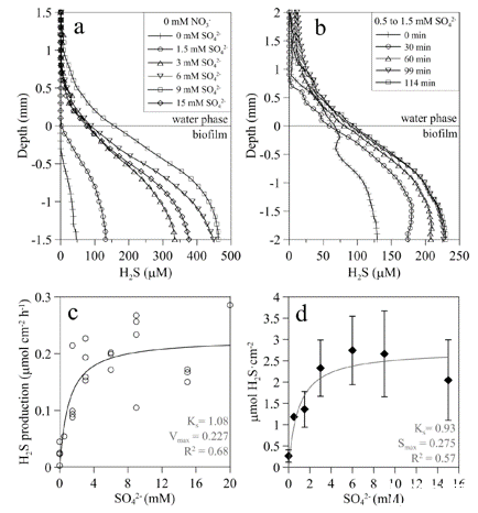 圖2、廢水生物膜中的硫化物動力學。(a)隨著硫酸鹽濃度的增加,具有代表性的垂直H 2 S濃度分布。(b)硫酸鹽濃度從0.5增加到1.5 mM的生物膜中硫化物濃度曲線隨時間演變的示例。(c)隨著硫酸鹽濃度的增加,硫化物的凈面積產量(生物膜的前1.5毫米)。(d)深度積分的平均H2S濃度(μmol cm-2)±標準偏差隨硫酸鹽濃度的增加(對于0.5和20 mM SO4 2-,n=1,對于6和15 mM,n=4,n=其余5個)。從測量的H 2S計算綜合平均H 2 S濃度從表面到生物膜內1.5毫米深度剖面。從圖中可以看出生物膜內的穩態硫化物濃度明顯取決于上覆水相中硫酸鹽的可用性(圖2A)。硫化物生產和氧化過程對本體水相中硫酸鹽濃度的變化反應非常迅速(圖2B)。最大的變化發生在前30分鐘內(圖2B)。無論測定濃度如何,曲線在90分鐘內達到新的穩定狀態。