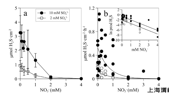 圖5、不同濃度硝酸鹽(0-4 mM)修正的廢水生物膜中硫化物濃度與深度積分凈硫化物產率的關系。(a)深度積分的平均H 2 S濃度(μmol cm-2)±標準偏差和(b)不同硝酸鹽濃度下的深度積分凈H 2 S產率。插入的圖表顯示了擬合線性指數衰減方程(y=ae-bx,ln y=ln a-bx)的相同數據,其中b=-1.3840,ln a=-2.08,R 2=0.65(在2 mM硫酸鹽)和b=-1.3869,lna=-0.64和R 2=0.75(在10 mM硫酸鹽下)。硝酸鹽添加對硫化物的影響是濃度依賴性的,生物膜內的平均綜合硫化物濃度隨著添加的硝酸鹽增加而降低(圖5A所示)。生物膜的空氣凈硫化物生產速率隨著硝酸鹽濃度的增加而呈指數下降,這在2和10 mM硫酸鹽下具有相同斜率的一級動力學(圖5B所示)。