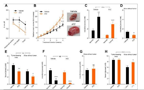 圖5、用乙酰唑胺進行體內治療可酸化小鼠ErbB2誘導的乳腺癌組織的微環境,降低乳酸濃度,并加速腫瘤生長。A)使用pH敏感微電極(n=8)進行的體內pH測量。“核心”被定義為在用電極逐步刺穿期間遇到的酸性最強的區域。在記錄前30分鐘,小鼠已接受腹膜內注射50 mg/kg乙酰唑胺(ATZ)或同等體積的載體。通過重復測量雙向方差分析比較數據。B)示例性事后剖析腫瘤圖像和體內ErbB2誘導的乳腺癌生長曲線,小鼠每天腹腔注射40 mg/kg ATZ與接受等體積載體的小鼠(n=17)相比。將數據擬合為二階多項式函數,并通過額外的平方和F檢驗比較最佳擬合參數。比例尺代表5mm;兩個圖像都以相同的放大倍數顯示。C-H)通過微透析評估的腫瘤糖酵解代謝。在ATZ或載體給藥開始后1小時測量間質或血清[乳酸](C–E)和[葡萄糖](F–H)。