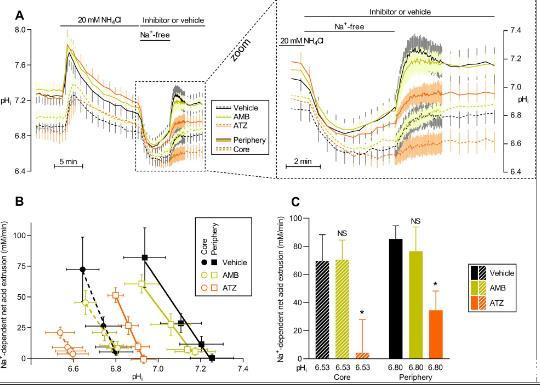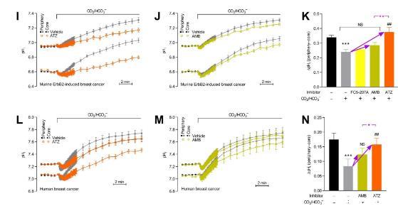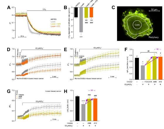 圖4、細胞內碳酸酐酶的抑制降低了小鼠ErbB2誘導的乳腺癌組織中細胞凈酸擠出的能力。A在NH 4+前脈沖誘導的細胞內酸化和隨后的恢復過程中,新鮮分離的乳腺癌類器官中pH i的平均曲線(n=6)。使用乙酰唑胺(ATZ,100μM)、4-氨基乙基)苯磺酰胺(AMB,30μM)或等量的DMSO載體進行實驗。面板的右側部分顯示放大的細胞內酸化恢復階段。B凈酸擠出繪制為類器官外圍和核心區域pHi的函數從ErbB2誘導的小鼠乳腺癌組織中新鮮分離(n=6)。C在最大酸化過程中對應于初始pHi恢復階段的固定pH i計算的凈酸擠出(n=6)。
