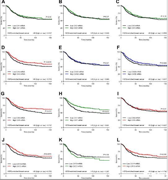 圖2、具有已知細胞外表達的碳酸酐酶亞型CA4、CA6、CA12和CA14、具有已知線粒體表達的CA5β和具有已知細胞溶質表達的CA7可積極預測富含HER2的乳腺癌患者的預后。A–L富含HER2的乳腺癌患者(n=358–860)的生存曲線根據每種碳酸酐酶亞型的mRNA表達進行分層。曲線的顏色編碼區分具有已知細胞外或分泌(紅色)、細胞溶質(綠色)和線粒體(藍色)表達的碳酸酐酶亞型。