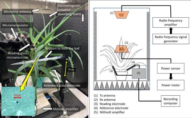 在本研究中,由于電解質(zhì)含量較高且具有用作生物能源的潛力,選擇蘆薈植物作為實驗植物。此外,蘆薈植物含水量較高,整個植物含水量為98.5%,葉凝膠介質(zhì)含水量為99.5%澆水良好的植物。由于組織中的水分和電解質(zhì)含量較高,蘆薈植物可能對電磁輻射暴露具有較高的敏感性。基于這種垂體,我們在受控實驗室研究中研究了不同頻率微波對蘆薈植物靜息電位和受傷(火焰燃燒)誘導(dǎo)的VP的影響。