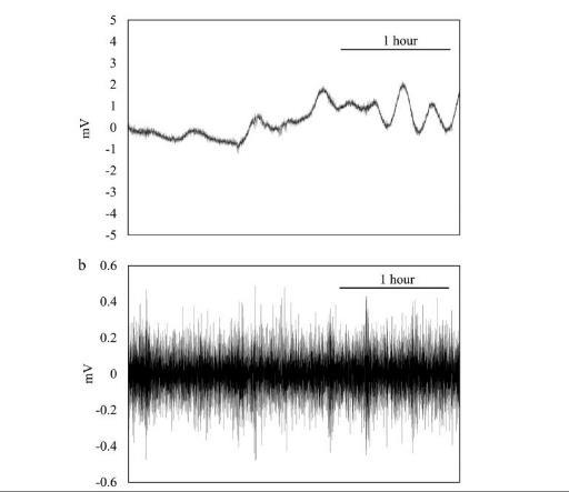 圖3、連續(xù)記錄3小時的木立蘆薈葉靜息電位的代表性圖像通過將起始靜息電位值設(shè)為0來標(biāo)準(zhǔn)化靜息電位。針對a的整個數(shù)據(jù)集計算每個相鄰數(shù)據(jù)點之間的電勢差。并與時間密謀。橫軸表示時間,縱軸表示電位。