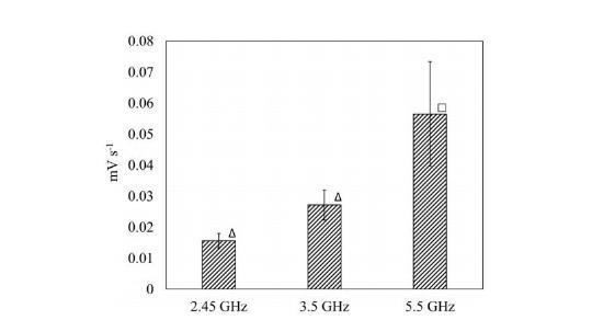 圖5、在2.45 GHz、3.5 GHz和5.5 GHz暴露下,木立蘆薈葉片火焰損傷誘導(dǎo)電信號中觀察到的特征電位反轉(zhuǎn)峰處的電位極化率。誤差線代表標(biāo)準(zhǔn)誤差。符號Δ和□有顯著差異。