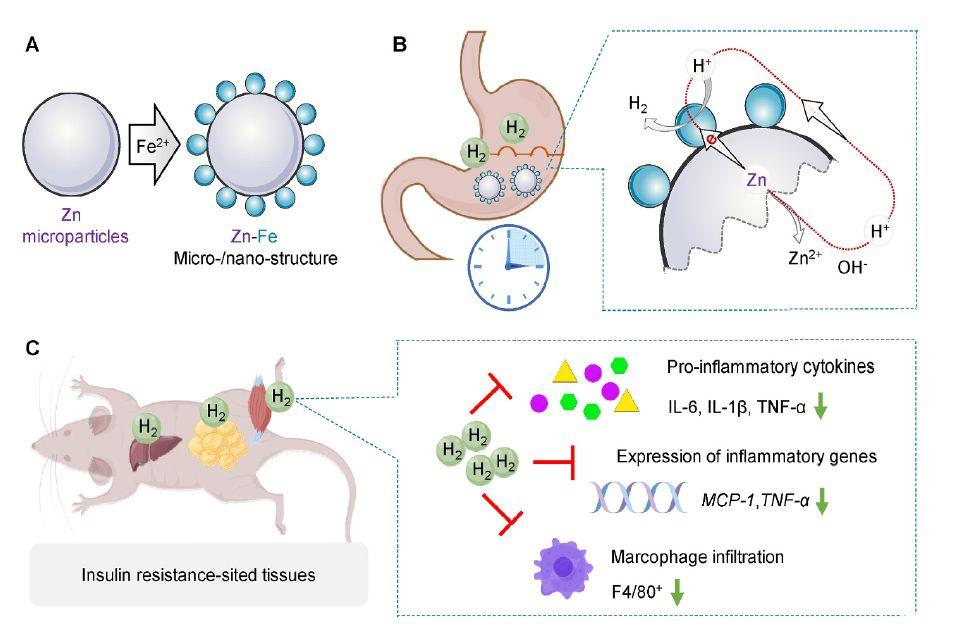 圖1、Zn-Fe原電池微納米結(jié)構(gòu)的結(jié)構(gòu)和構(gòu)建方法示意圖(A)、加速Zn水解和H2產(chǎn)生的原電池原理(B)、胰島素中H2的高效積累口服Zn-Fe給藥后抵抗部位的組織支持增強抗炎和改善胰島素耐受性(C)。