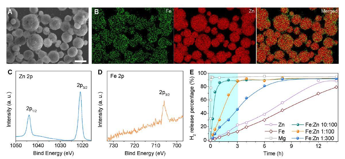 圖2、Zn-Fe微/納米顆粒的代表性SEM圖像(A)和相應(yīng)的EDS元素圖(B)、Zn-Fe微/納米顆粒的XPS譜(C,D)以及Mg、Fe的酸響應(yīng)H 2生成曲線、Zn和Zn-Fe微/納米顆粒在模擬胃酸溶液中具有不同的Fe/Zn比(E)。圖A中的比例尺對應(yīng)于5μm。