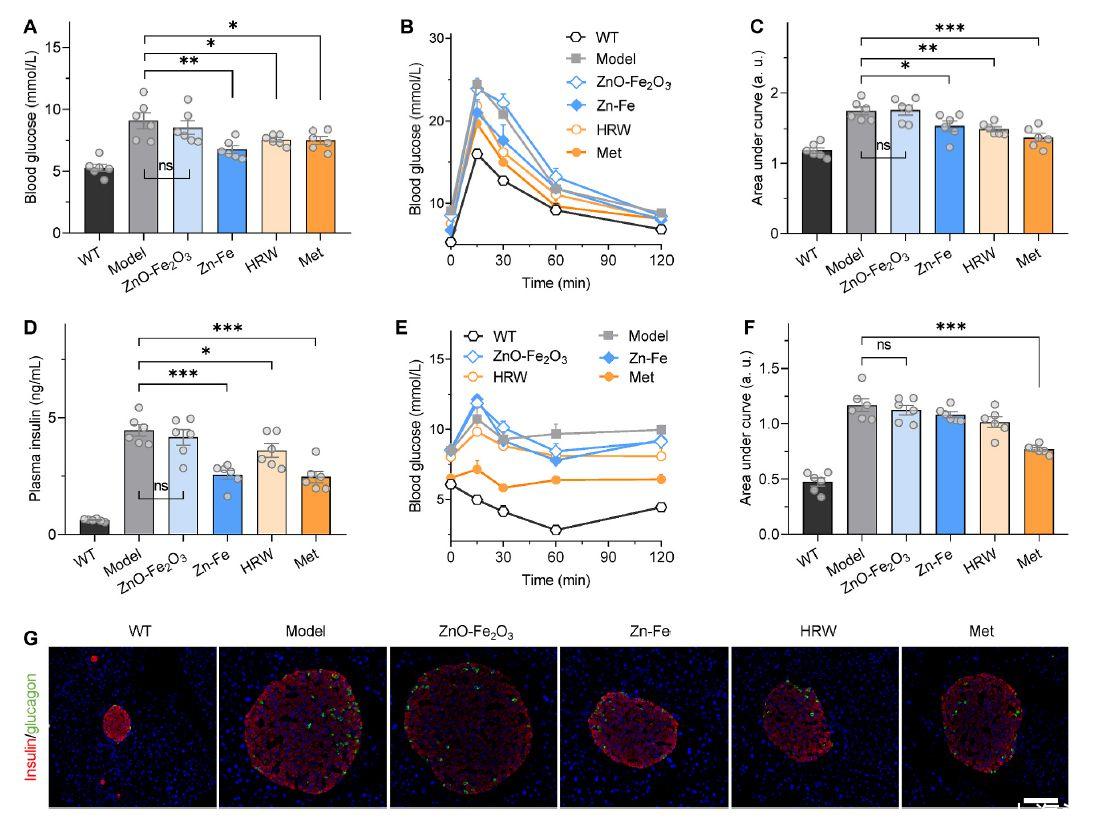 開發(fā)了一種Zn-Fe原電池微/納米顆粒,通過原電池反應(yīng)在胃中具有加速酸響應(yīng)H2釋放行為。通過調(diào)節(jié)Zn和Fe的比例,控制H2釋放速率,實現(xiàn)胃代謝時間窗內(nèi)持續(xù)H 2釋放。口服Zn-Fe微米/納米顆粒在一些IR相關(guān)組織(包括肝臟、骨骼肌和白色脂肪組織)中引起相對較高的H 2濃度和H 2的長時間保留。研究發(fā)現(xiàn)在肥胖相關(guān)的2型糖尿病ob/ob小鼠中,這些胰島素敏感組織的炎癥受到抑制,IR得到改善。同時口服Zn-Fe微/納米顆粒顯示出較高的安全性。