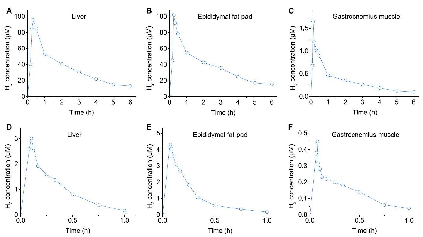 6至8周齡雄性野生型(WT)C57BL/6J小鼠以0.1 mL的劑量灌胃施用Zn-Fe(20 mg/mL,水溶液)或HRW(0.8 mmol/LH 2,水溶液)/10克體重(BW)(相當(dāng)于Zn-Fe 200 mg/kg BW)。通過Clark型H 2傳感器(Unisense,丹麥)實時監(jiān)測肝臟、脂肪組織(附睪脂肪墊)和骨骼肌(腓腸肌)中的H2濃度。
