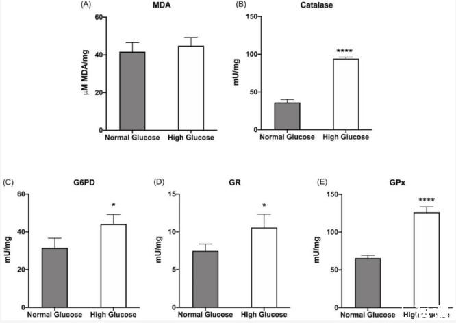 圖2、在正常或高葡萄糖培養基中生長的ARPE-19細胞中的脂質過氧化和抗氧化防御:(A)丙二醛(MDA)濃度作為脂質過氧化的標記;(B)過氧化氫酶活性;(C)葡萄糖6-磷酸脫氫酶(G6PD)活性;(D)谷胱甘肽還原酶(GR)活性;(E)谷胱甘肽過氧化物酶(GPx)活性。所有測試的酶都參與細胞抗氧化防御。灰色柱代表在5.6 mM葡萄糖(正常葡萄糖,對應于通常用于生長這些細胞的葡萄糖濃度)下生長的ARPE-19細胞獲得的數據,白色柱代表在高葡萄糖培養基(25 mM)中生長的相同樣品。
