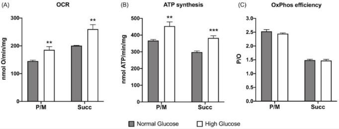 圖1、生長培養基中葡萄糖濃度對ARPE-19細胞有氧代謝的影響:(A)耗氧率(OCR);(B)有氧ATP合成;(C)P/O值作為OxPhos效率標記。在存在丙酮酸加蘋果酸(P/M)或琥珀酸(Succ)的情況下評估了有氧代謝,以分別刺激復合物I、III和IV以及復合物II、III和IV的途徑。灰色柱代表在5.6 mM葡萄糖(正常葡萄糖,對應于通常用于生長這些細胞的葡萄糖濃度)下生長的ARPE-19細胞獲得的數據,白色柱代表在高葡萄糖培養基(25 mM)中生長的相同樣品。