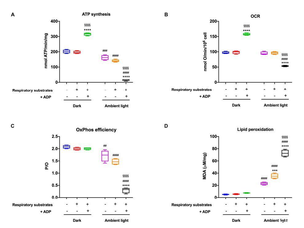 圖4、ATP合成、耗氧率、氧磷效率和脂質過氧化。圖所示的所有數據均已獲得從與呼吸底物(0.6 mM)預孵育或未孵育的牛棒狀OSs中提取NADH和20 mM琥珀酸鹽/或0.1 mM ADP,并在黑暗中維持(A)通過F1Fo-ATP合成ATP。合成酶和(B)耗氧量(OCR);在兩個實驗中都是0.1 mM加入NADH誘導OCR和ATP合成。(C)P/O值,OxPhos效率的標志,計算為合成ATP與消耗氧氣的比值。(D)MDA含量作為脂質過氧化標志物。數據具有四個獨立重復的代表性(n=4)。
