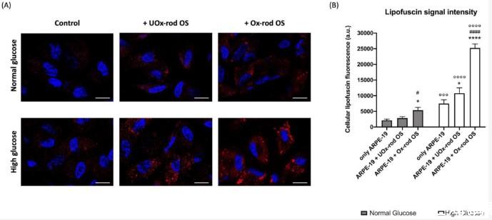 圖5、在正常或高葡萄糖培養基中生長并與UOx-或Ox-rod OS一起孵育的ARPE-19細胞中脂褐素的積累。(A)代表性共焦圖像,報告在正常葡萄糖(NG)和高葡萄糖(HG)條件下生長并與UOx-或Ox-rod OS一起孵育的ARPE-19細胞中細胞質脂褐質積累(紅色信號)。藍色信號對應于用DAPI染色的細胞核。條形刻度對應于10μm。(B)脂褐質熒光信號的強度。灰色柱代表在NG條件下生長的ARPE-19細胞獲得的數據,白色柱代表在HG條件下生長的相同樣品。