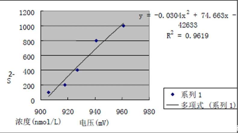 S2-濃度在100-1000nmol/l之間濃度值與硫電極所測電壓值呈線形相關性(圖1-1),所得方程為