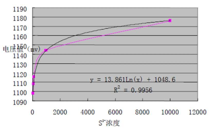 S2-濃度在1-100μmol/L之間濃度值與硫電極所測電壓值呈明顯對數相關性(圖1-2),所得方程為