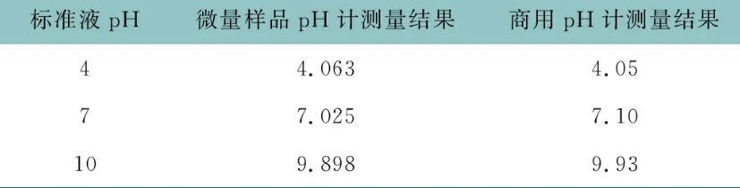 為了檢驗微量樣品pH計測量樣品pH是否準確,用商用pH計與該微量樣品pH計同時測量pH分別為4、7、10的標準液并進行對比,結果如表1所示。