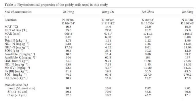 表1、四種不同水稻土中的土壤理化性質(zhì)。四種水稻土分布取自與中國的不同區(qū)域,分布來自于四川的資陽(ZY)、廣西的雷州(LZ)、浙江的嘉興(JX)、江蘇江都(JD).結(jié)合數(shù)據(jù)分析可以看出,土壤樣品中除了資陽的水稻土壤偏堿性,其余的樣品偏弱酸性。