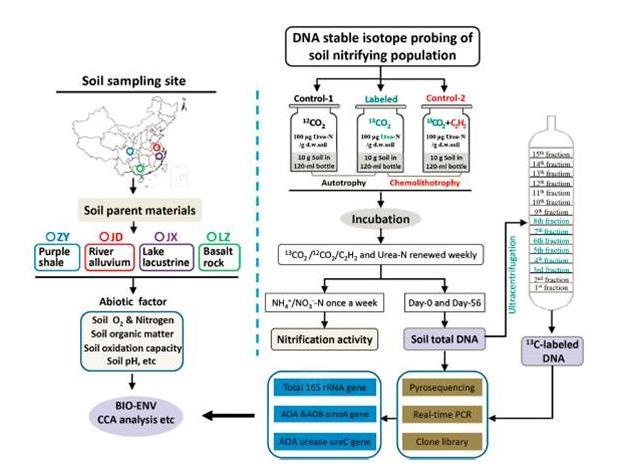 圖2、使用穩(wěn)定性同位素核酸探針技術(shù)研究不同水稻土中氨氧化細(xì)菌與氨氧化古菌的硝化貢獻(xiàn)率。左邊的圖表示的是所取水稻土樣品的地理位置,右邊表示的是穩(wěn)定性同位素核酸探針(DNA-SIP)技術(shù)示意圖,利用標(biāo)記底物進(jìn)行合成代謝的微生物細(xì)胞,基于DNA半保留復(fù)制原理,不斷合成13C-DNA,而不利用標(biāo)記底物的微生物細(xì)胞其DNA全部都是12C-DNA。培養(yǎng)結(jié)束后對土壤基因組的總DNA進(jìn)行提取,通過超高速密度梯度離心將13C-DNA與12C-DNA分離,進(jìn)一步采用分子生物學(xué)技術(shù)對13C-DNA進(jìn)行下游分析,從而達(dá)到揭示微生物復(fù)雜生態(tài)系統(tǒng)重要過程。