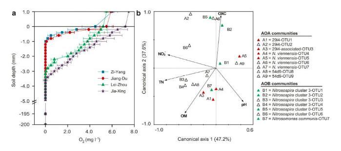 圖1、A表示的是四種水稻土中的氧濃度的剖面圖,其中藍(lán)色方塊代表的是四川資陽、紅色圓圈表示的是江蘇揚(yáng)州江都區(qū)、綠色三角形是廣西雷州、黑色五角星代表的是浙江嘉興。圖B表示的是氨氧化細(xì)菌的典型biplot分析,即關(guān)于四種水稻土中亞硝酸細(xì)菌與其水稻土的理化性質(zhì)之間的biplot分析。