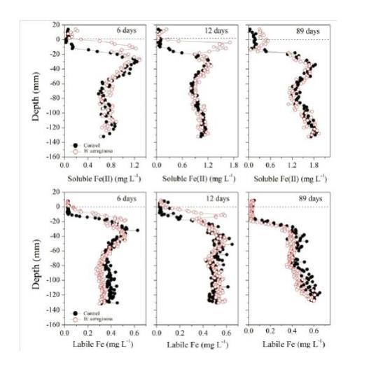 圖5、孵化后第6、12和89天,福壽螺生物擾動對沉積物中可溶性Fe(II)和不穩定的Fe濃度的影響。