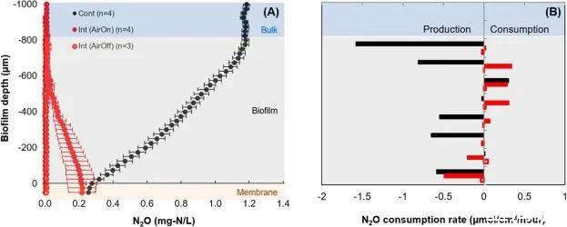 圖3.MABR中微觀輪廓的比較在連續(xù)曝氣(連續(xù)相)和間歇曝氣(Int6+6 air-on and air-off phases):(A)N2O剖面,(B)凈體積氮的空間分布N2O生物膜內(nèi)的生產(chǎn)/消費率。