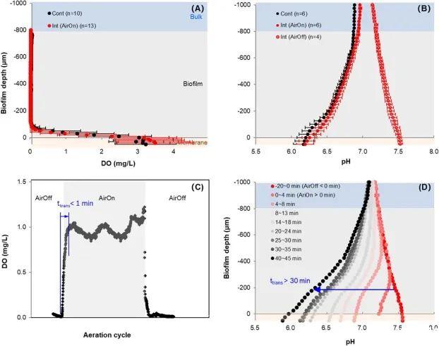 微量剖面分析包括(1)連續(xù)和間歇曝氣之間生物膜pH和DO的比較(2)凈體積氮的計算N2O在不同生物膜深度下的反應速率,以及(3)ttrans用于pH值、溶氧和N2O間歇曝氣。生物膜溶氧比較中包括生物膜底部的氧穿透深度(μm)和溶解氧濃度。氧穿透深度定義為從膜-生物膜界面到生物膜層的距離,其中DO濃度達到0.01 mg/L(檢測限)。生物膜pH值比較中包括體積pH值和生物膜基底的pH值。與學生檢驗(95%CI)進行比較。凈容積N2O使用Fick第二擴散定律根據(jù)各自的濃度曲線估計每種曝氣控制下的反應速率。使用Microsoft Office Excel 2010進行統(tǒng)計分析,并應用了的加載項求解器N2O費率計算。ttrans使用曝氣循環(huán)期間記錄的濃度時間序列進行估計。