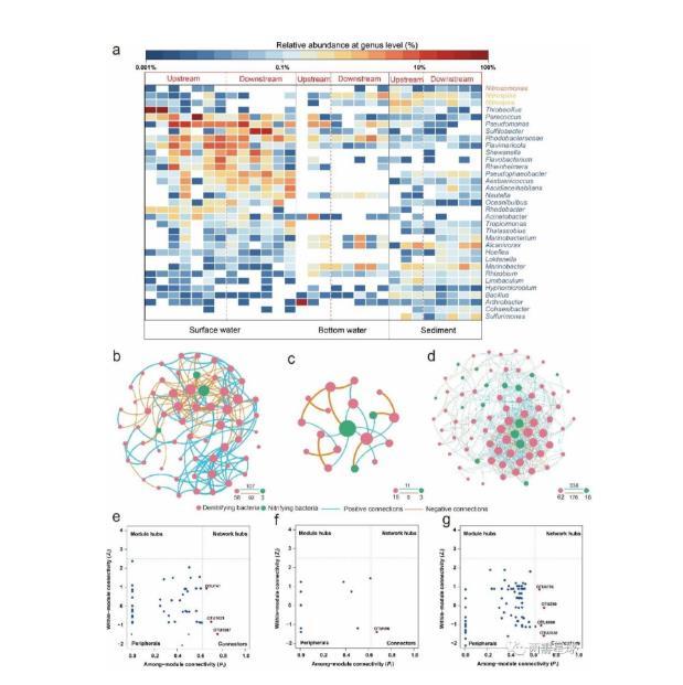 圖3 PRE硝化與反硝化細(xì)菌的相對豐度及共生網(wǎng)絡(luò)。各采樣點(diǎn)硝化和反硝化細(xì)菌的相對豐度(a)。構(gòu)建的微生物網(wǎng)絡(luò)可視化:表層水(b)、底層水(c)和沉積物(d)。根據(jù)拓?fù)渥饔美L制了表層水(e)、底層水(f)和沉積物(g)中細(xì)菌群落的Pi-Zi圖。