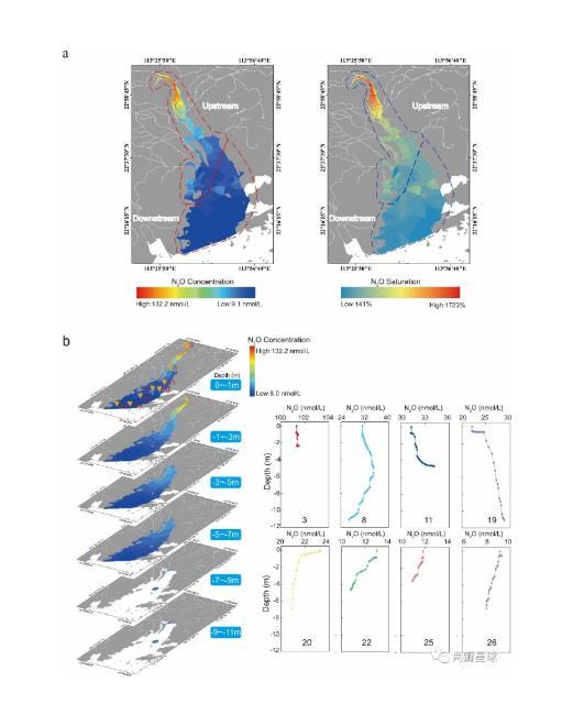 圖2 N2O濃度和飽和度的二維高分辨率分布。地表水中溶解性N2O的濃度和飽和度(a)。溶解性N2O濃度分布的垂直剖面圖(b)。