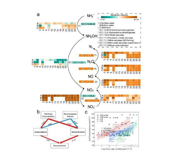 圖6氨氧化和反硝化群落對PRE N2O生成的驅(qū)動效應(yīng)。PRE各采樣點(diǎn)的氮代謝途徑和強(qiáng)度(a)。結(jié)構(gòu)方程模型(SEMs)顯示營養(yǎng)濃度、環(huán)境因素和相關(guān)功能基因?qū)λw中溶解N2O濃度的影響(b)。AOA amoA、AOB amoA、nirS和nirK基因豐度與水體中溶解性N2O之間的關(guān)系(c)。