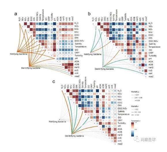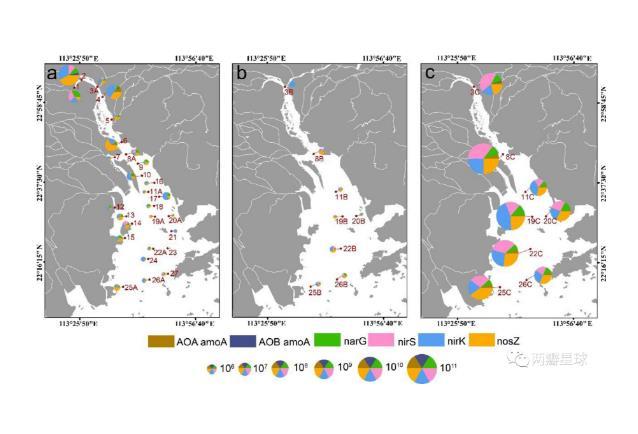 圖4氨氧化和反硝化功能基因在PRE地表水(a)、底層水(b)和沉積物(c)中的分布。