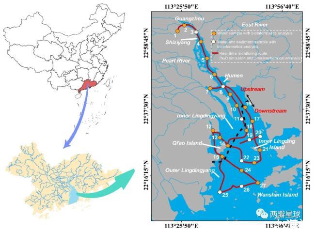 圖1中國珠江口地區(qū)的研究區(qū)域和實(shí)時高分辨率監(jiān)測軌跡點(diǎn)。沿監(jiān)測軌跡(紅色曲線)采集了約27600個N2O濃度和環(huán)境參數(shù)(溶解氧(DO)、氧化還原電位(ORP)、鹽度、濁度、pH值和溫度)數(shù)據(jù)點(diǎn)。