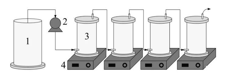 本實驗采用有機玻璃制作的反應器模擬下水道.裝置示意如圖1所示,4個密封的反應器串聯排列,反應器高150mm,內徑80mm,內壁貼有PVC薄片作為生物膜生長的載體,下部放置磁力攪拌器攪拌模擬水流沖刷剪切力,磁力攪拌器轉速與剪切力的關系為: