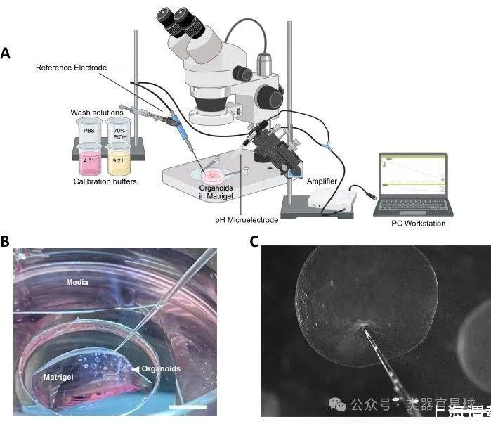 pH微電極可以選購Unisense公司產品,其由直徑25微米的斜面玻璃尖端組成。測量時,將pH微電極推進到懸浮在Matrigel中的類器官(>200微米)的腔內,而參比電極則浸沒在培養皿的周圍培養基中。