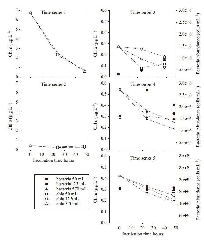 圖2.不同時間序列實驗中的葉綠素a濃度和細菌豐度。