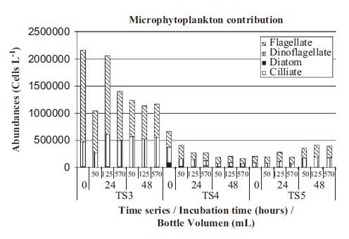 圖3、不同時間序列實驗中最常見的微型浮游生物群落的貢獻。