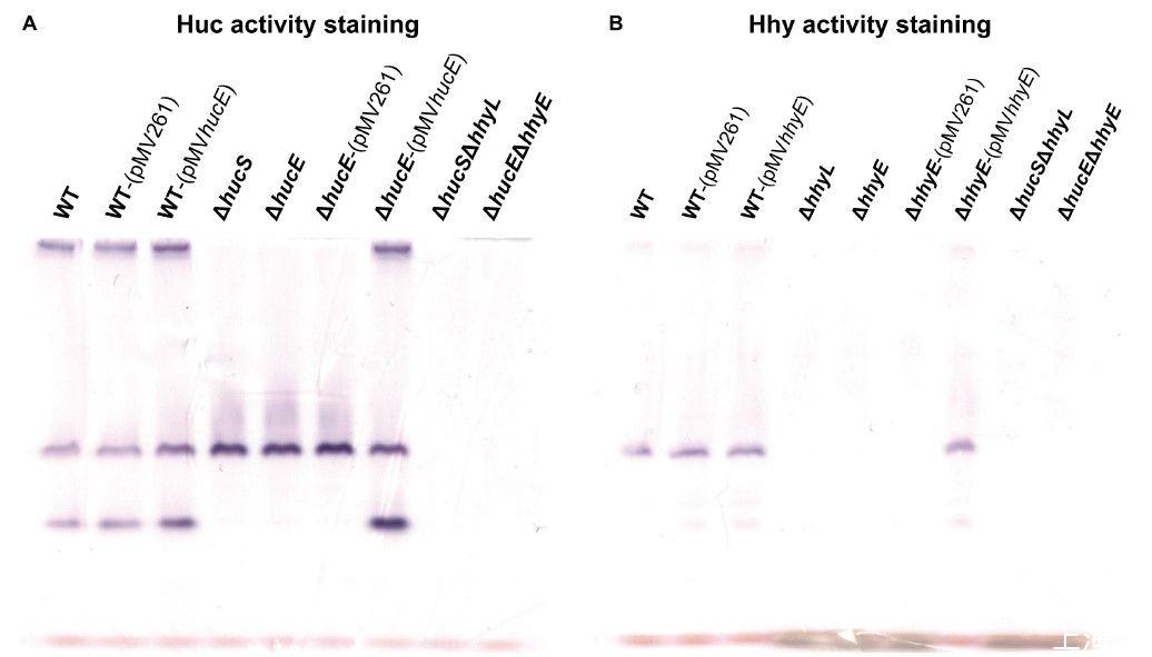 圖3、恥垢分枝桿菌野生型、衍生突變株和互補(bǔ)突變株中的氫化酶活性染色。全細(xì)胞裂解物用于在富含H 2的氣氛中以硝基藍(lán)四唑作為人工電子受體對(duì)H 2攝取進(jìn)行酶譜染色。(A)野生型、ΔhucS、ΔhucE、ΔhucSΔhhyL、ΔhucEΔhhyE、以及互補(bǔ)的ΔhucE和野生型恥垢分枝桿菌(帶有空pMV261或互補(bǔ)載體pMV hucE)培養(yǎng)物的Huc活性染色)在早期穩(wěn)定期(OD max~3.0后24小時(shí))收獲。(B)野生型、ΔhhyL、ΔhhyE、ΔhucSΔhhyL、ΔhucEΔhhyE和互補(bǔ)的ΔhhyE和野生型恥垢分枝桿菌(帶有空pMV261或互補(bǔ)載體pMV hhyE)培養(yǎng)物的Hhy活性染色)在中期穩(wěn)定期(OD max~3.0后72小時(shí))收獲。