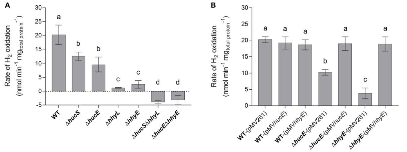 圖2、恥垢分枝桿菌。野生型、衍生突變體和互補(bǔ)突變株的氫氧化。使用Unisense微呼吸H2電極通過(guò)電流分析法測(cè)量整個(gè)細(xì)胞在中期穩(wěn)定期(OD max~3.0后72小時(shí))對(duì)H 2的吸收。(A)鐵硫蛋白野生型、單突變體和雙突變體(ΔhucE、ΔhhyE、ΔhucEΔhhyE)以及氫化酶結(jié)構(gòu)亞基單突變體和雙突變體(ΔhhyE)之間H 2氧化速率的比較hucS,ΔhhyL,ΔhucSΔhhyL)。(B)分別用hucE和hhyE的表達(dá)補(bǔ)充的ΔhucE和ΔhhyE菌株中的H 2氧化速率。對(duì)照包括用空載體pMV261轉(zhuǎn)化的野生型、ΔhucE和ΔhhyE菌株以及用互補(bǔ)載體pMV hucE和pMV hhyE轉(zhuǎn)化的野生型菌株。