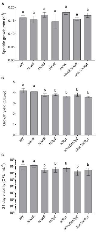 圖4、恥垢分枝桿菌。野生型和突變株的生長(zhǎng)和存活率比較。七個(gè)菌株在補(bǔ)充有Tween80(LBT)的溶源肉湯中生長(zhǎng):鐵硫蛋白的野生型、單突變體和雙突變體(ΔhucE、ΔhhyE、ΔhucEΔhhyE),以及氫化酶結(jié)構(gòu)亞基的單突變體和雙突變體ΔhucS,ΔhhyL,ΔhucSΔhhyL)。(A)指數(shù)期的特定生長(zhǎng)率(μ)。(B)穩(wěn)定期后24小時(shí)的最終生長(zhǎng)產(chǎn)量(OD max)。(C)穩(wěn)定期后21天的長(zhǎng)期存活率(CFUmL–1)。