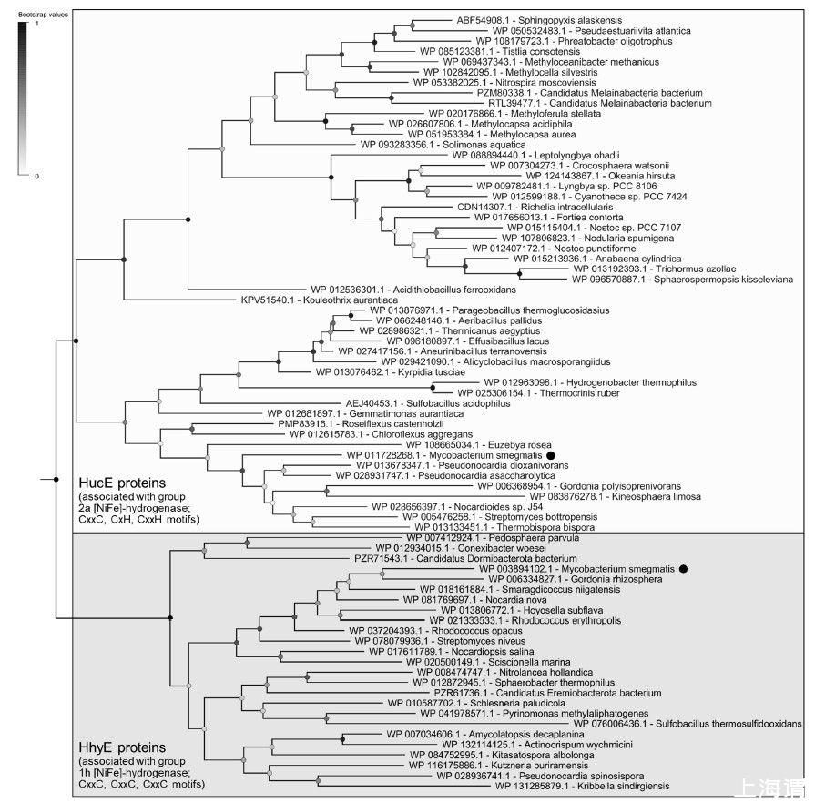 圖1、與2a組和1h[NiFe]-氫化酶相關(guān)的HucE和HhyE蛋白的系統(tǒng)發(fā)育樹(shù)。該樹(shù)可視化了52個(gè)全長(zhǎng)HucE和26個(gè)全長(zhǎng)HhyE序列的代表性子集之間的進(jìn)化關(guān)系。強(qiáng)調(diào)了恥垢分枝桿菌編碼的蛋白質(zhì)。該樹(shù)是使用最大似然法(用部分刪除處理間隙)構(gòu)建的,用100個(gè)重復(fù)進(jìn)行引導(dǎo),并在中點(diǎn)扎根。