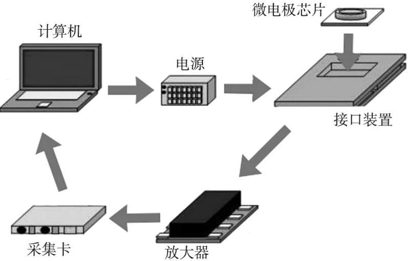 膜片鉗技術對神經細胞電信號進行采集需要受過良好訓練的電生理學專家進行,采集難度較大,且通量低、數據采集慢。基于微電極對神經細胞電信號進行采集,可將細胞直接在電極芯片上進行無創培養,隨時觀察其生長情況,進而方便、快速地采集到神經細胞電信號。雖然以微電極陣列為傳感器對神經細胞電信號進行采集的方法由來已久,但是一直存在因為電極材料問題使得神經細胞不能很好地在電極表面生長且影響觀察,或者沒有相對應的外圍放大濾波裝置使得神經細胞電信號不能很好地獲得等問題。