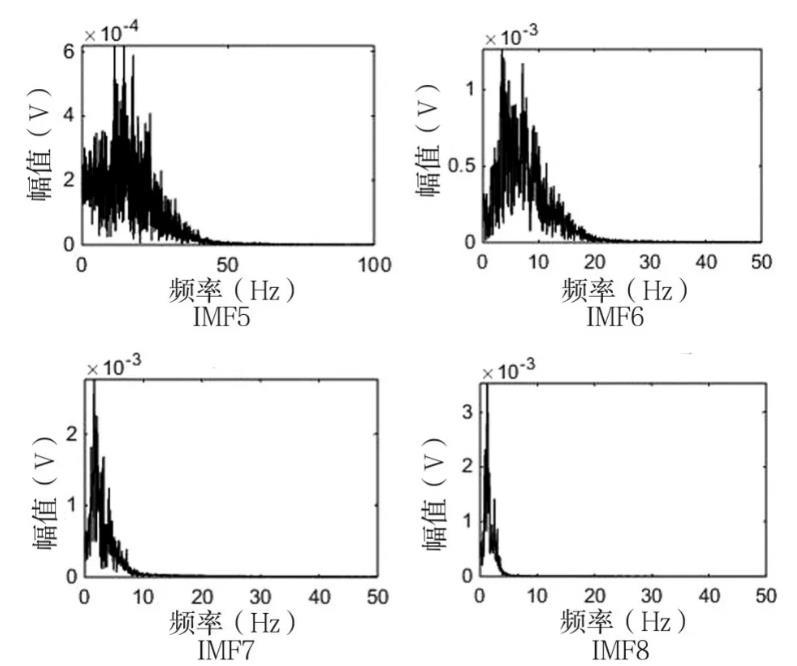 由圖5可以看出,IMF1~IMF4的幅頻特性圖中,包含很多大于50Hz的峰值,而IMF5~IMF8的幅頻特性圖中峰值主要集中于0~50Hz。進一步可以判定IMF1~IMF4為噪聲部分,IMF5~IMF8為信號的有用部分。