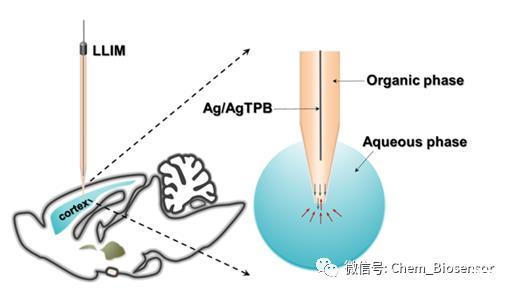 液/液界面電化學基于兩個相鄰相中離子的溶劑化能差異在直接分析檢測方面取得了巨大進展。這些離子通過它們的特征離子轉移電位和離子電流信號或者通過改變有機相中合適的配體或離子載體促進離子轉移過程被識別。因此,液/液界面化學傳感在無需電極修飾的情況下可直接活性和非活性離子,并且成功用于測量神經遞質、藥物、氨基酸、肽和蛋白質。然而,液/液界面尚未應用于體內分析,這為分析非活性的神經化學物質提供了一種新的有效平臺。基于此,中國人民大學化學系張美寧教授課題組展示了一種液/液界面微傳感器(LLIM)用于活體監測非活性神經化學物質膽堿(Ch)。當微傳感器插入大鼠大腦時,會形成液/液界面。如果施加適當的電壓,則該界面上將發生離子轉移進行Ch的高選擇性和靈敏度檢測。