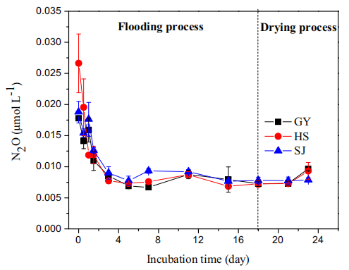 圖3、洪水-干燥過程中上層水溶解N2O濃度的變化。