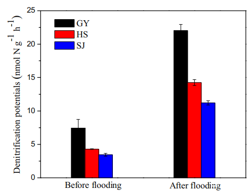 圖5、洪水處理前后表層沉積物(0~2 cm)的潛在反硝化速率比較。